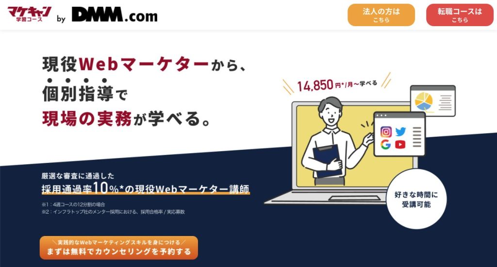マケキャンbyDMM.comは、転職成功率98%を誇るWebマーケティングスクール。圧倒的に優れたサポート体制やキャリアカウンセリング制度が整っており、転職で失敗したくないなら間違いありません。