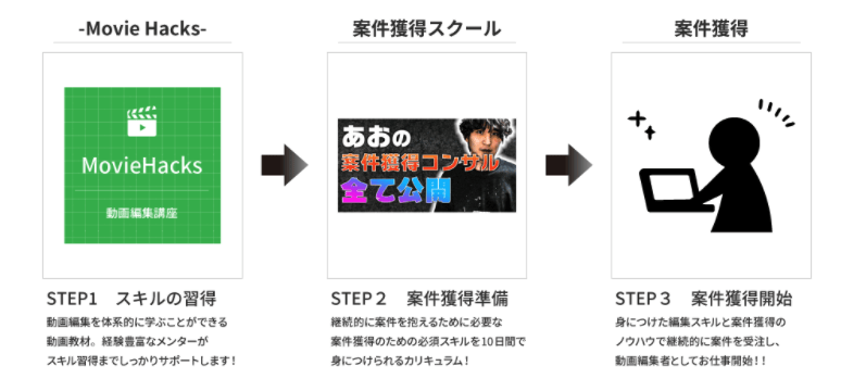 残念ながらMovieHacksは、受講後に100%稼げる「魔法のスクール」ではありません。しかし本気で動画編集を勉強したい方にとって、最適な学習カリキュラムやサポート体制を提供していますよ。
